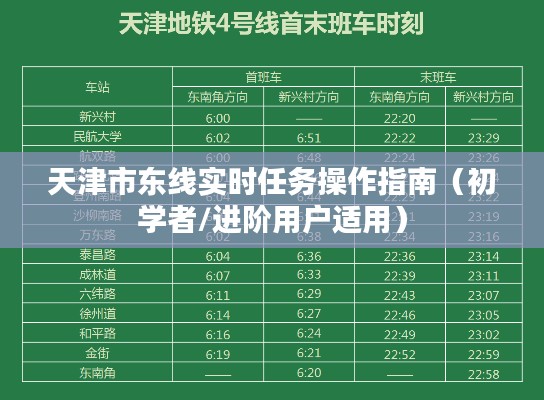 天津市东线实时任务,对于初学者和进阶用户来说,是一项需要掌握的技能或任务,随着科技的不断发展,天津市东线实时任务涉及的内容越来越广泛,从交通管理到公共服务等多个领域都有所涉及,本指南旨在帮助读者顺利完成天津市东线实时任务,确保每一步操作都准确无误。