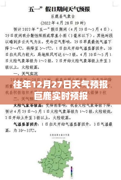 在往年12月27日,巨鹿地区的最低气温预计为-4℃,最高气温可达4℃,市民需根据天气情况合理搭配衣物,以防寒冷天气对身体造成不适。