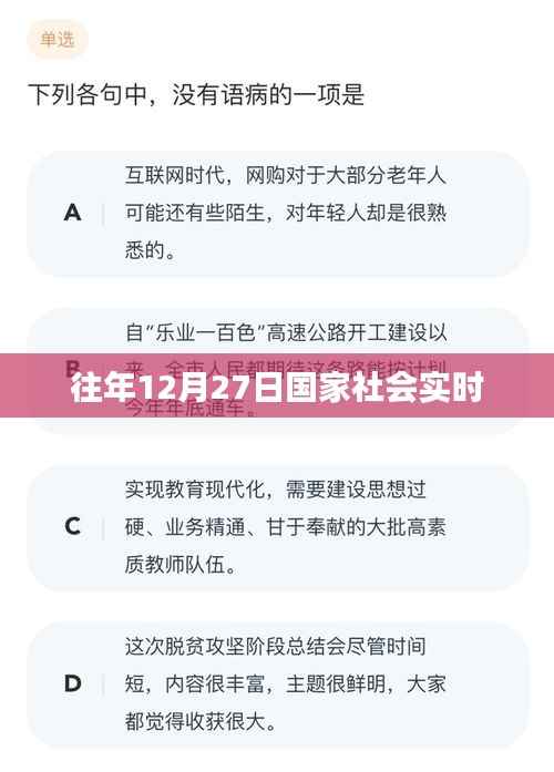 在往年12月27日,国家在社会各个领域都取得了显著成就,面对未来,我们要继续坚持创新、协调、绿色、开放、共享的发展理念,推动经济社会持续健康发展,还要加强对外合作,拓展国际合作空间,推动全球治理体系变革,在未来,我们要继续努力,为实现中华民族伟大复兴的中国梦贡献力量。