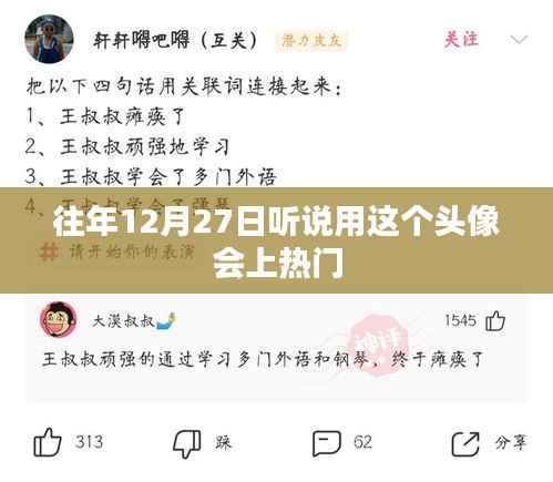 往年12月27日听说用这个头像会上热门的现象,是社交媒体时代的一种特殊现象,我们应该理性看待这种现象,注重内在的品质和实力,同时也要尊重他人的选择,在选择头像时,我们应该根据自己的个性和态度来挑选,希望通过头像展示真实的自我。