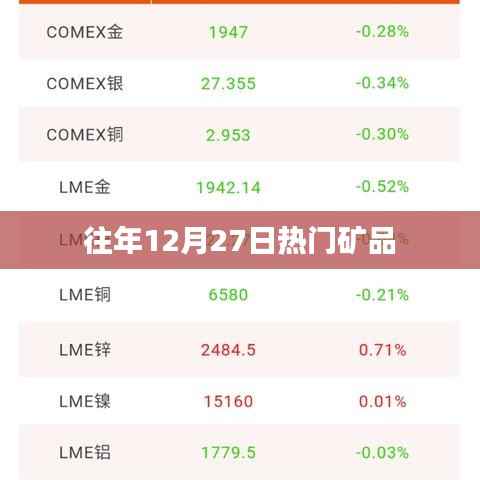 随着科技的不断进步和全球经济的持续发展,矿业行业始终保持着旺盛的活力,每年的12月27日,全球各地的矿业市场都会涌现出一批热门矿品,这些矿品因其独特的性质、广泛的应用和市场的热捧而备受关注,本文将围绕往年12月27日的热门矿品展开,探讨其特点、应用和市场趋势。