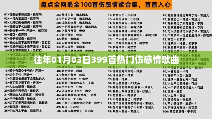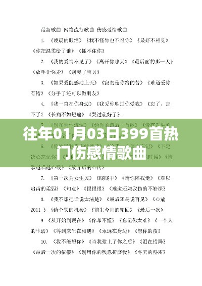 每年的1月3日,都有许多伤感情歌在耳边回荡,它们像是一种情感的宣泄,让我们沉浸在深深的哀伤之中,我们就来回顾一下往年这一天最热门的399首伤感情歌,让我们一起感受那些关于爱情、关于生活的酸甜苦辣。