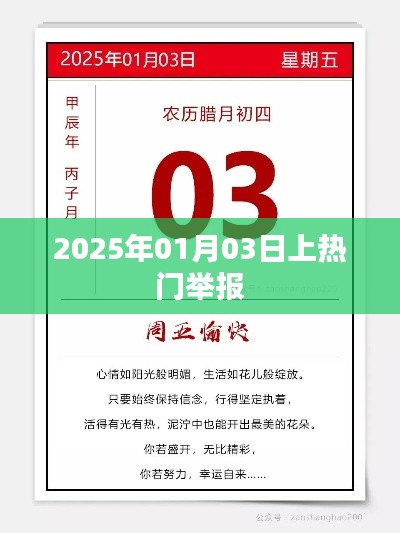 随着互联网的普及和社交媒体的兴起,信息的传播速度日益加快,热门话题往往在短时间内引发广泛关注,本文将围绕“2025年01月03日上热门举报”这一主题展开,介绍相关事件背景、经过、结果以及引发的社会反响,并对整个事件进行深入分析和思考。