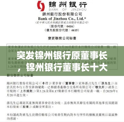 据官方通报,锦州银行原董事长因突发健康原因,无法继续履行职务,经董事会研究决定,由某位资深金融人士接替其职位。这一突发情况让许多人感到意外,同时也为锦州银行的发展带来了不确定性。