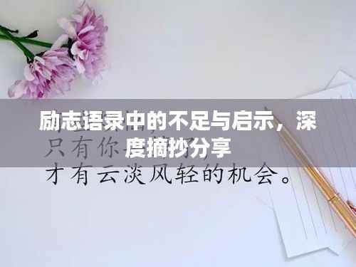 认识缺点的重要性: 认识到自己的缺点是成长的第一步,一个学生意识到自己在数学方面的不足后,可以制定学习计划来加强数学能力的学习和提升成绩,只有正视自己的不足并勇于改正错误才能不断进步。 缺点背后的力量: 每一个缺点背后都隐藏着巨大的潜力等待发掘,例如一个曾经内向害羞的人通过不断挑战自己参加社交活动逐渐变得开朗自信这种转变不仅提高了他的社交能力也让他的人生更加丰富多彩面对困难时的态度: 当面对困难时不要抱怨自己的缺点要勇敢面对并努力克服它们,正如一位企业家在创业过程中遇到重重困难但他坚信自己的能力带领团队克服了一个又一个难关最终取得了成功这种精神值得我们学习如何克服缺点: 克服缺点需要付出努力和时间制定明确的目标积极学习和寻求帮助是有效的途径之一此外保持信心相信自己有能力克服缺点是至关重要的例如一位运动员在比赛中遇到挫折时他选择坚持训练寻求教练和队友的帮助最终取得了优异的成绩结语: 人生路上总会有困难和挫折但只要我们勇敢面对坚持不懈地努力就一定能够克服它们让我们用励志语录摘抄中的话语激励自己不断前行去迎接更美好的未来!无论遇到什么困难都要相信自己有能力克服勇往直前!