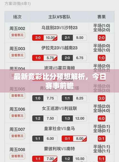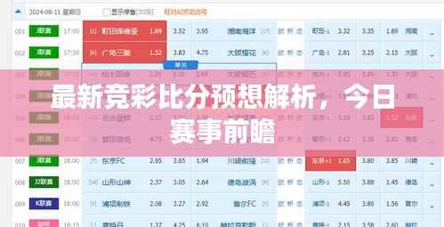 随着体育产业的蓬勃发展,竞彩已经成为越来越多人关注的焦点,对于热爱竞彩的朋友们来说,了解最新的赛事信息、分析比赛走势,以及预测可能的比分,都是提升竞彩体验的重要环节,本文将根据最新的赛事信息,为大家带来今日竞彩比分预想的分析。