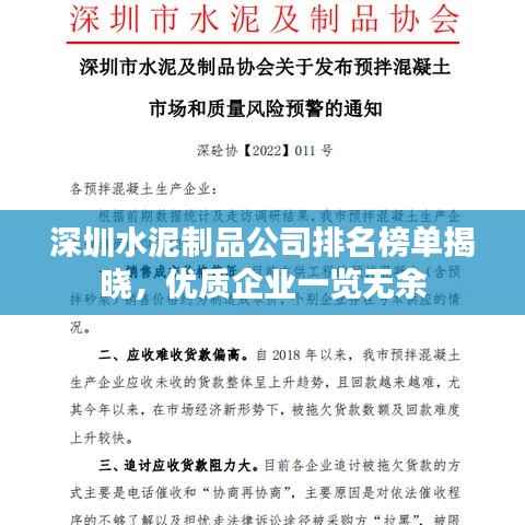 随着城市化建设的不断推进,水泥制品在城市建设中的应用越来越广泛,深圳作为我国的一线城市,其水泥制品市场发展迅速,众多水泥制品公司如雨后春笋般涌现,本文将介绍深圳水泥制品公司排名榜,以便消费者更好地了解市场,选择优质的水泥制品。