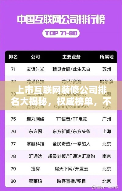 随着互联网的普及和装修市场的蓬勃发展,越来越多的互联网装修公司应运而生,这些公司借助互联网的力量,通过线上线下的方式,为广大消费者提供一站式的装修服务,本文将介绍当前市场上几家知名的上市互联网装修公司的排名。