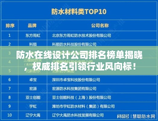 随着互联网的普及和建筑行业的飞速发展,防水在线设计公司逐渐崭露头角,这些公司依托先进的在线设计工具、专业的设计团队以及丰富的行业经验,为客户提供优质的防水设计服务,本文将介绍几家在行业内颇具影响力的防水在线设计公司,并探讨它们的排名。
