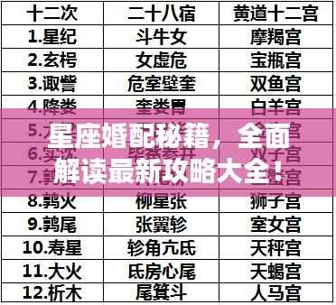 随着人们对星座文化的热衷,星座婚配逐渐成为大家关注的焦点,本文将为大家带来最新星座婚配攻略,帮助大家了解各星座之间的情感匹配度,为恋爱、婚姻提供参考。