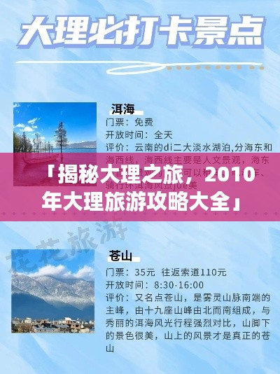 大理,这座古老而美丽的城市,自古以来就是旅游者的梦想之地,2010年,大理以其独特的自然风光、丰富的民族文化和深厚的历史底蕴吸引了无数游客,本攻略将为您详细介绍2010年大理的旅游资源,带您领略这座城市的魅力。