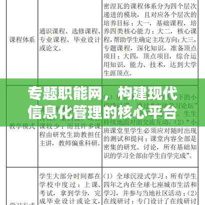 随着信息技术的飞速发展,网络已经成为现代社会不可或缺的基础设施,专题职能网作为现代信息化建设的重要组成部分,以其高效、便捷、精准的特点,正逐渐成为各行各业实现信息化管理的核心平台,本文将围绕专题职能网的概念、特点、作用及其在现代社会中的应用展开探讨。