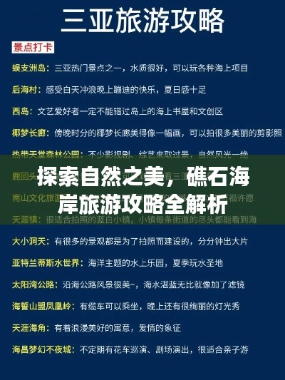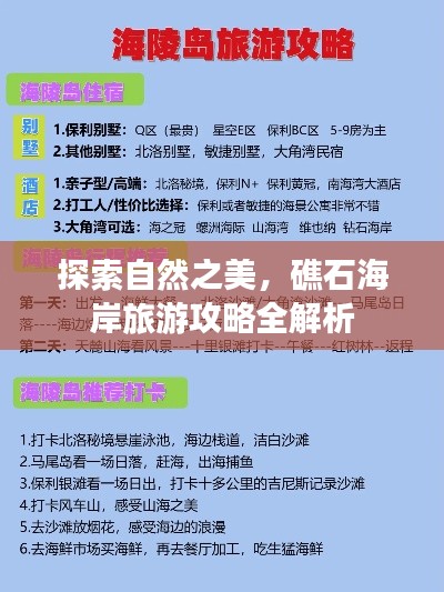 礁石海岸因其独特的自然景观和丰富的生态资源,成为越来越多旅游爱好者的目的地,本文将为你提供一份详尽的礁石海岸旅游攻略,帮助你更好地探索这片神秘而美丽的海域。