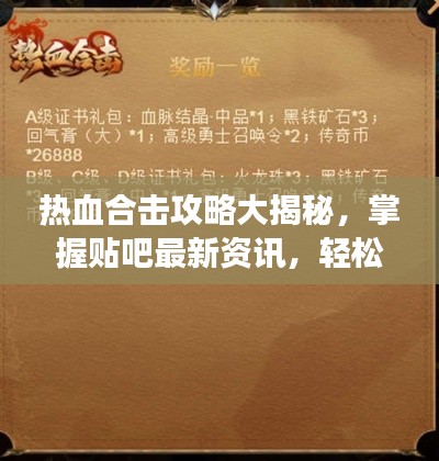 本文为你提供了热血合击的攻略资讯,结合贴吧热门讨论,助你轻松游戏上分,想要成为热血合击的顶尖高手,需要掌握游戏基础,关注贴吧最新资讯,团队协作,提升技巧,参与活动并保持良好的心态,希望这些攻略对你有所帮助,祝你在热血合击的世界里取得更好的成绩!