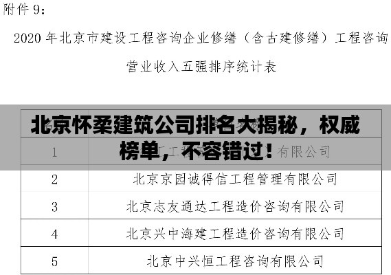 怀柔区作为北京市的一个重要区域,其建筑行业的发展日益繁荣,随着城市化进程的加快,怀柔区的建筑行业也在不断发展壮大,众多建筑公司在这一区域崭露头角,本文将为您介绍北京怀柔建筑公司的排名,以便您更好地了解这一领域的领军企业。