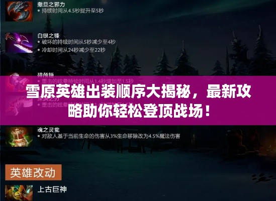 雪原作为游戏中一个充满挑战与机遇的场景,对于玩家的装备选择及出装顺序有着极高的要求,本文将为大家带来雪原出装顺序的最新攻略,帮助玩家更好地适应游戏节奏,提升生存与战斗能力。