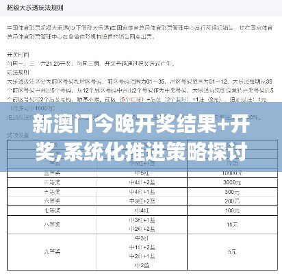 随着今晚新澳门开奖结果的临近,我们聚焦于这个备受瞩目的时刻,这不仅对本地居民具有重要意义,也吸引了全世界关注彩票的玩家的目光,这次开奖承载着澳门对于国家发展政策的积极响应和宣传,在新时代背景下,澳门的发展策略和政策调整对于社会经济、文化教育、旅游服务等各个领域产生了深远的影响,本文将深入探讨“系统化推进策略探讨”这一议题,旨在把握新澳门政策方向及发展规划,为激发社会活力、调整及升级经济结构贡献智慧力量。