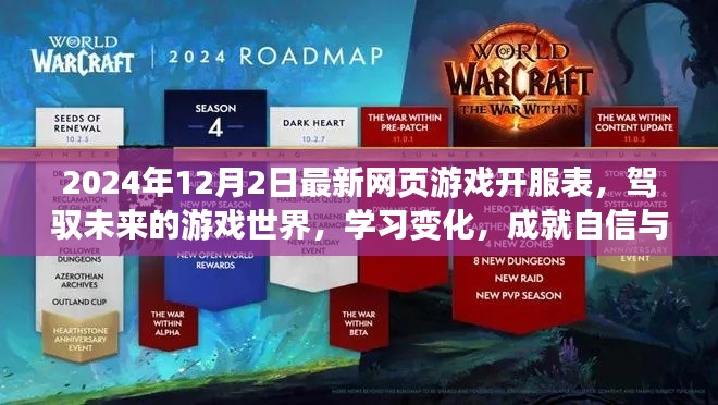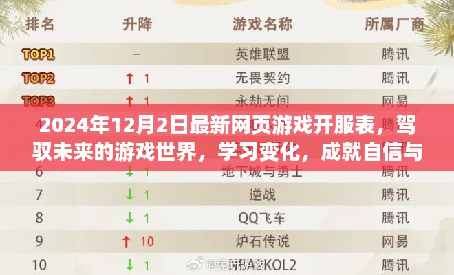随着科技的飞速发展,网页游戏作为一种新兴娱乐形式,以其独特的魅力吸引着越来越多的玩家,在这个充满机遇和挑战的时代,我们迎来了一个全新的日子——2024年12月2日,这一天,众多网页游戏纷纷开启新的服务器,邀请玩家们共同探索未知的游戏世界,让我们一起走进这个充满希望和梦想的世界,看看如何通过学习和变化,在游戏的道路上成就自信与成就感。