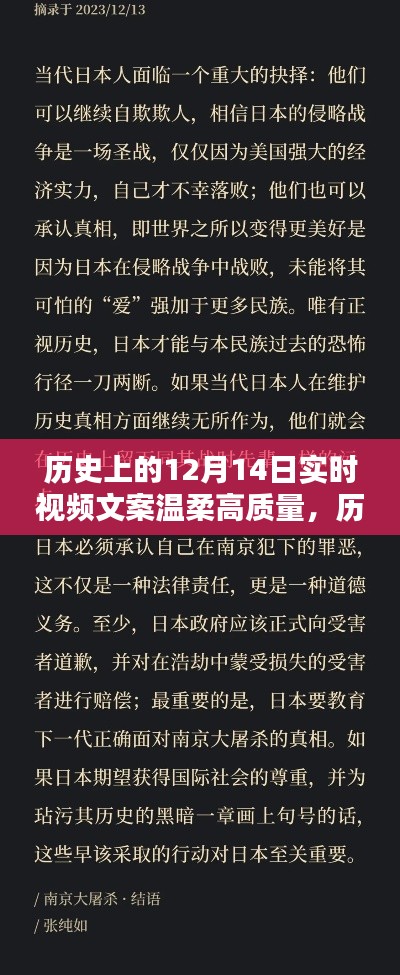 随着科技的进步,实时视频成为了记录历史的重要方式之一,通过高清的画质和真实的音效,我们能够直观地感受到那些历史瞬间的现场氛围,在今年的12月14日,让我们通过实时视频,重温历史上的今天,透过屏幕,我们可以目睹那些温柔高质量的瞬间,感受历史的韵味和温度。
